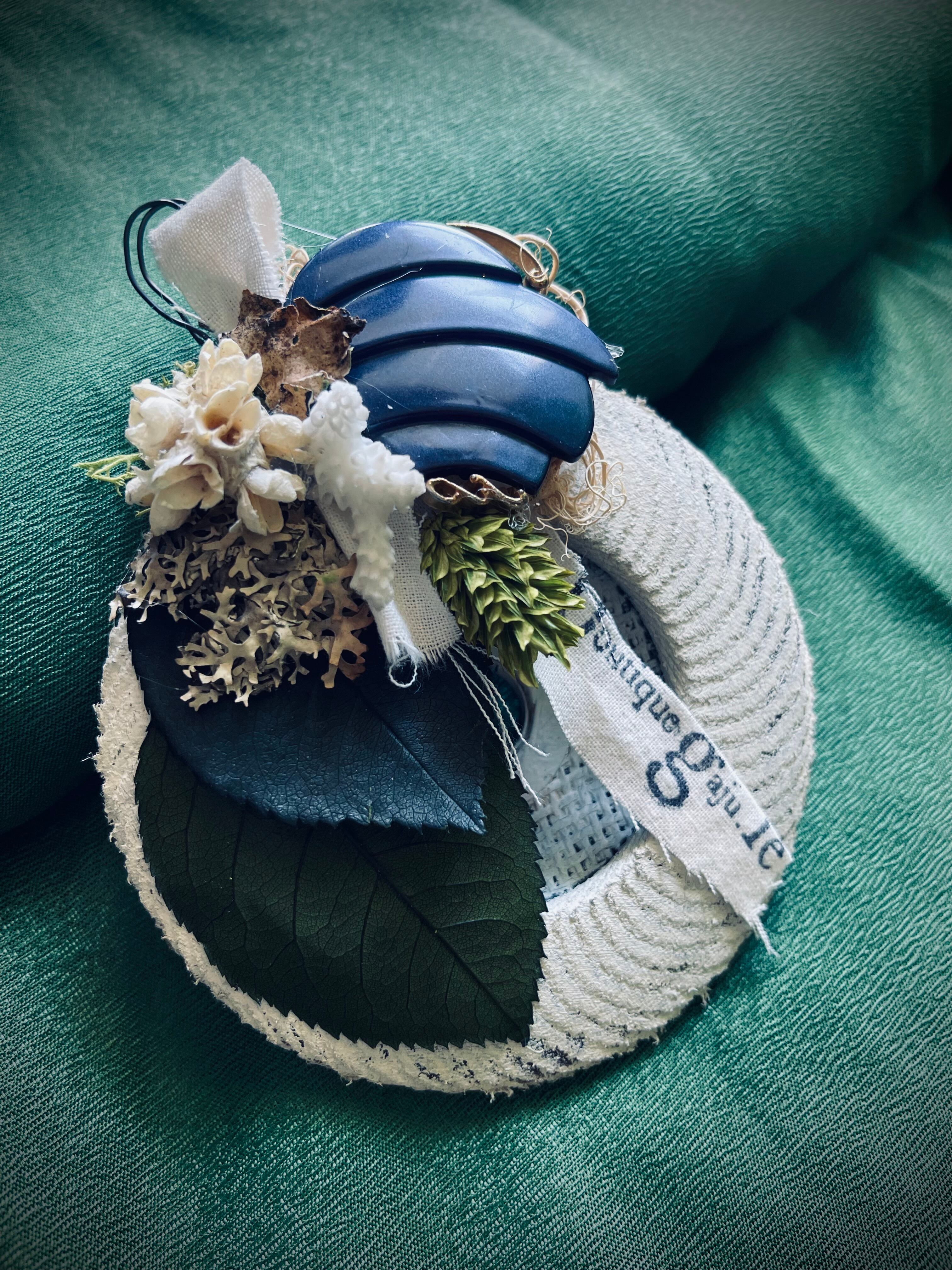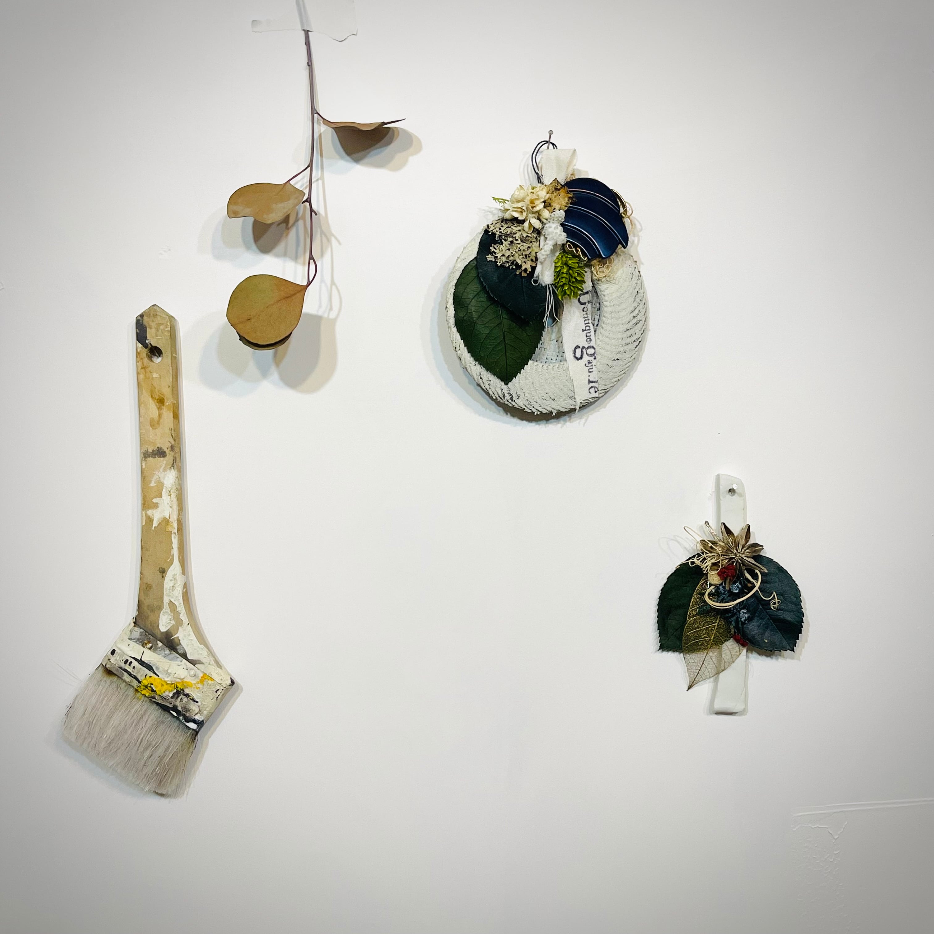 素材:ペイントした工具品(6°の果実)、アンティークのブローチ、金属、自然素材、プリザーブドフラワーなど。