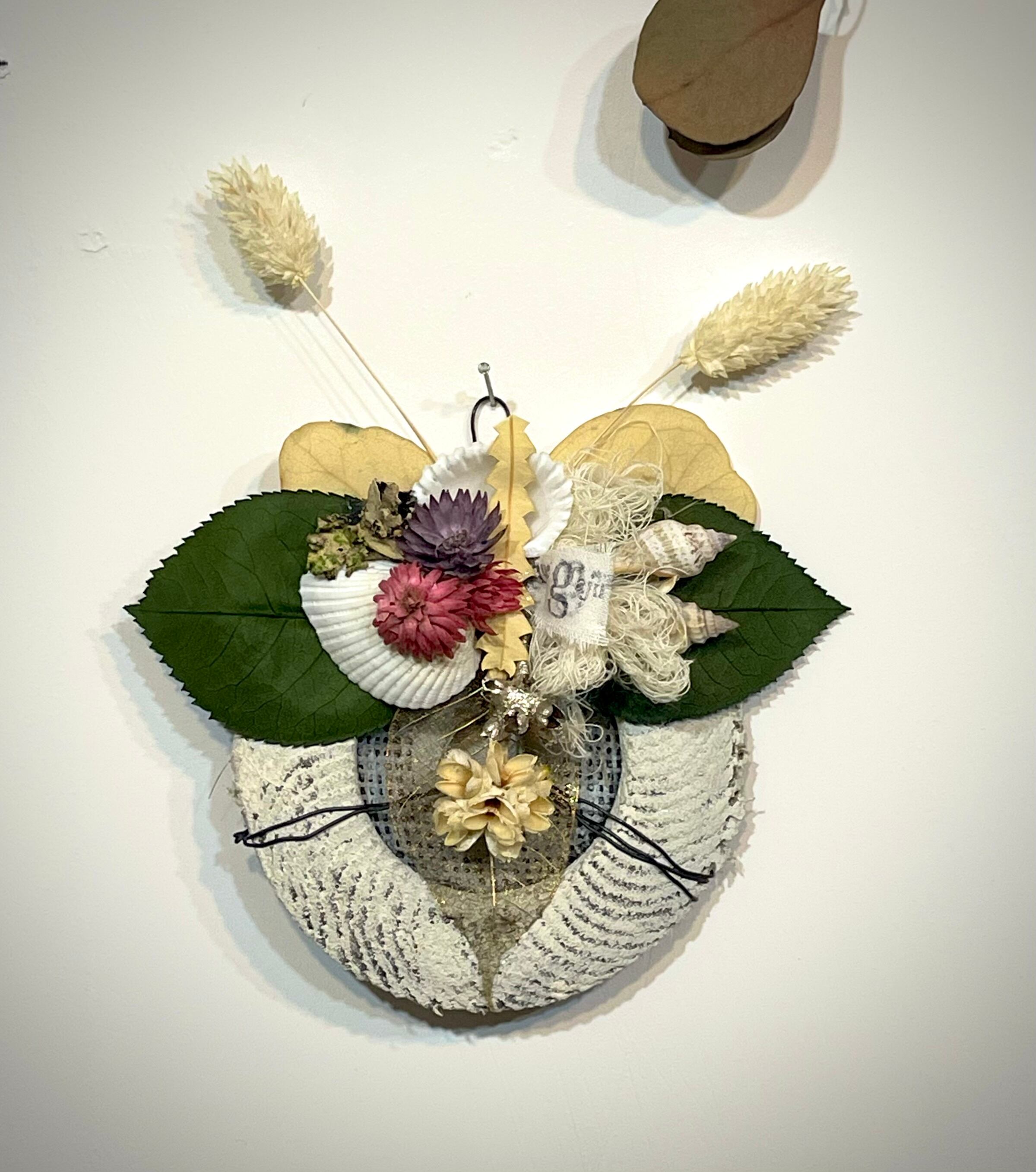 素材:ペイントした工具品、貝、金属、自然素材、プリザーブドフラワーなど。