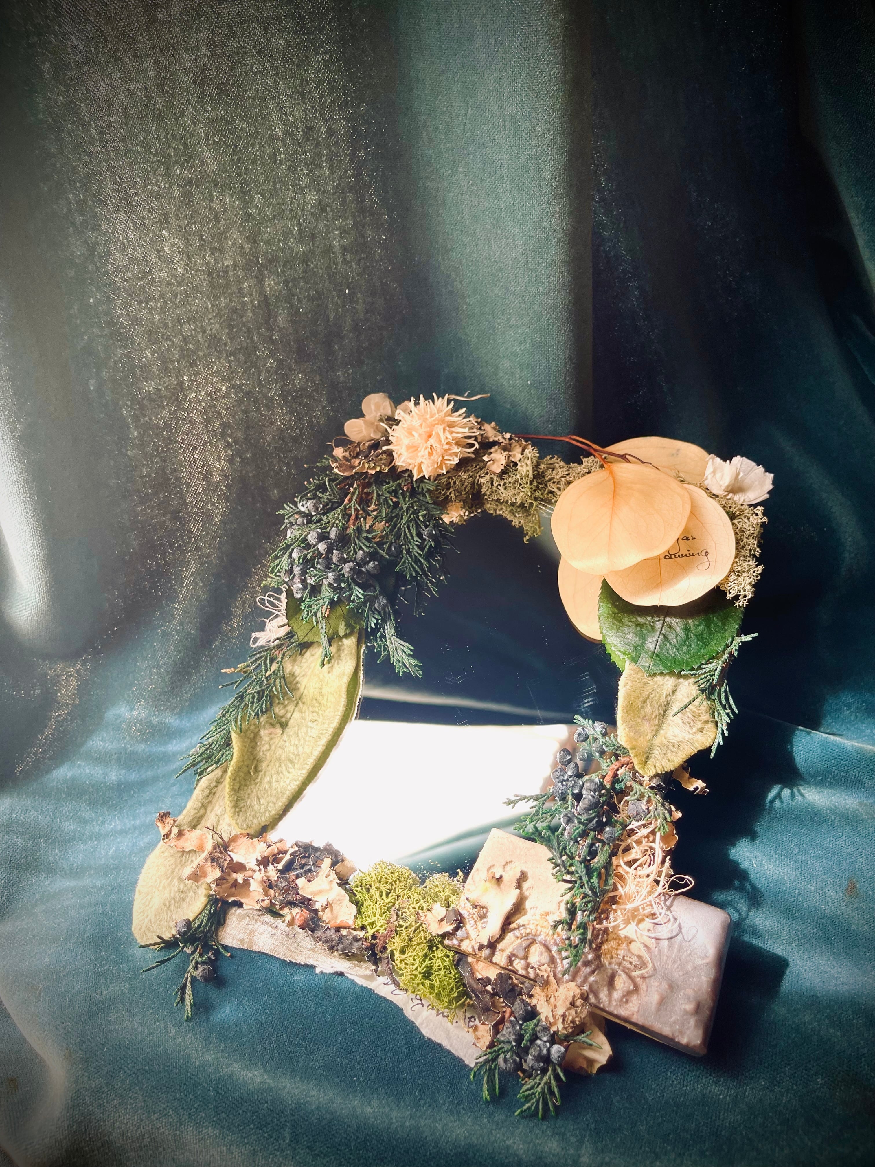 ちいさな鏡です。プリザーブの葉っぱや苔、私が制作した陶のタイルをデコレーションしました。まるで、森の中で水の流れる音に導かれ、道なき道を、そぉーっと進んでいる気持ちになりました。